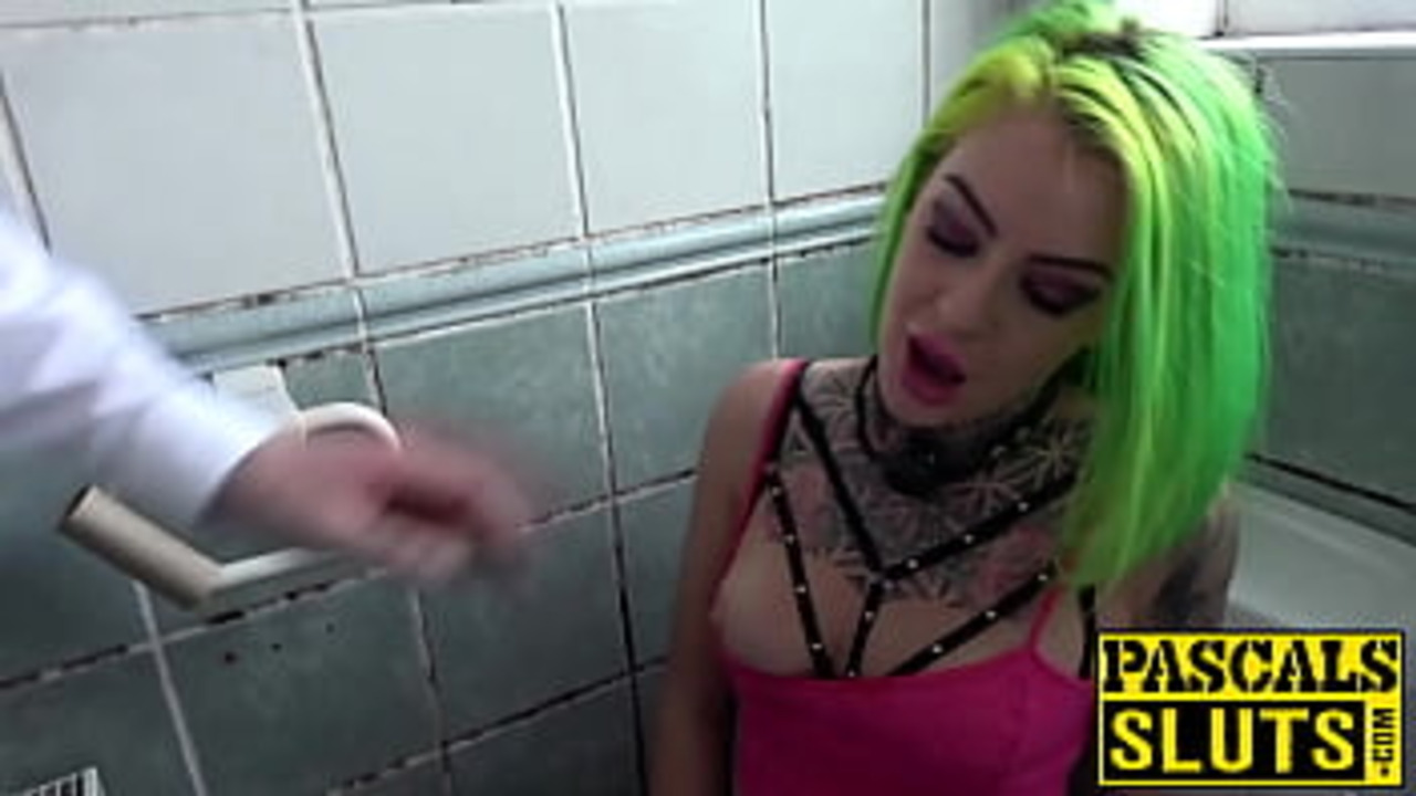 A green-haired British submissive slut gets her mouth thoroughly gagged with a ball gag while her ass is roughly fucked from behind. She takes deepthroat and swallows his load, all while being spanked and dominated by her strong maledom.