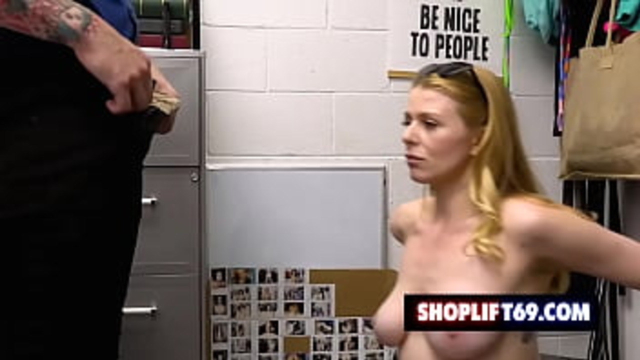 Sahara Skye, the busty blonde milf, gets caught stealing sexy lingerie at the store. The security guard confronts her, and she sucks his cock deep in a passionate blowjob. She then gets bent over and nailed hard in doggystyle, leaving her with a creampie.