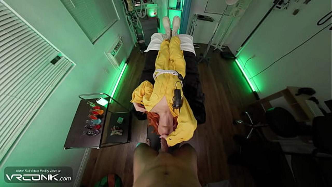 Skinny redhead April O'Neil slobbers on her TMNT cosplay partner's huge dick in a deepthroat reverse blowjob. She rides him hard in doggystyle and missionary, moaning loudly as he pounds her. He finishes with a big cumshot on her face.