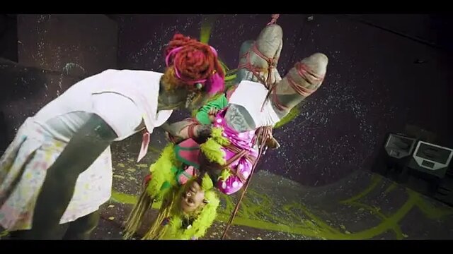 Rigger Lily lu, with her dreadlocks and tattoos, suspends two rope bunnys in a Shibari master class. She ties them up with intricate knots and pulls on the ropes to tease them. The scene is very dirty and goes into intense BDSM with the goth and emo aesthetic.